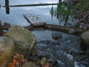 Im süd-westlichen Bereich erfolgt der Ablauf über ein Wehr, an dessen Seite sich eine Sohlgleite als Fischaufstieg erstreckt.